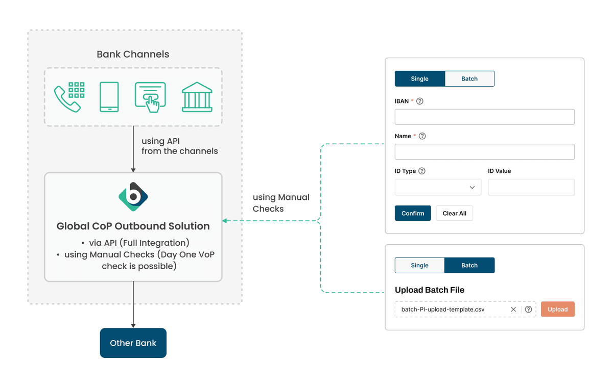 • Manual Checks by uploading batch files using Portal, that accepts pain.001 and .xls files in specific format
